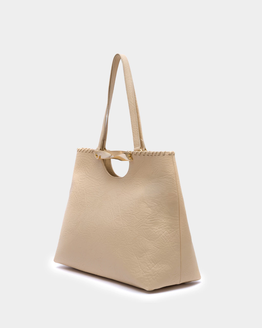 A Biah é a tote ideal para a rotina. Com duas opções de alça, ela se adapta ao uso do dia a dia: a de ombro garante mais conforto, enquanto a de mão leva o toque mais autoral com detalhe do metal torcido, identidade da marca. Feita em couro com estampa de búfalo, conhecido por sua resistência, ela carrega o essencial, incluindo notebook, com leveza e sofisticação. O detalhe de acabamento na boca, com entrelaçado manual, reforça a qualidade artesanal que acompanha cada peça.